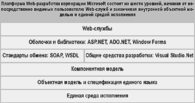 Так что же такое .NET? Можно дать следующее обобщенное определение: «Открытая для разных языков платформа для корпоративных и Web-разработок». Ее цель состоит в том, чтобы предоставить абстрактную машину для профессиональных разработчиков, подходящую как для традиционных (клиент-серверных, n-звенных), так и для Web-ориентированных приложений. На рис. 1 показаны шесть уровней общей структуры платформы.