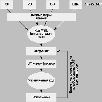 Среда единого языка .NET предлагает базовую схему исполнения, показанную на рис. 3. Компилятор языка порождает код MSIL, который не интерпретируется, а снова преобразуется с помощью JIT-компилятора во внутренний код. Таким образом, на целевой платформе будет исполняться только внутренний код.