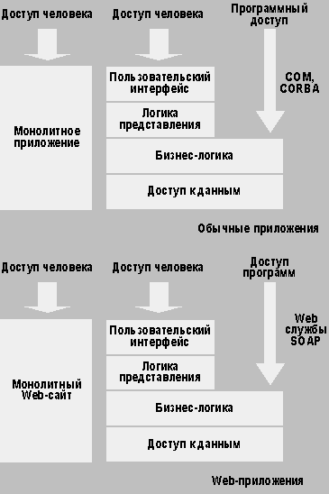 Увы, Web-технологии, которые создавались уже после появления многоуровневых моделей и стандартов открытых систем, не обошли те же самые «грабли» с монолитными приложениями. Преодоление этого состоит в применении Web-служб.