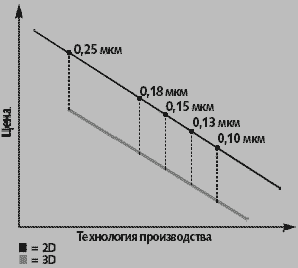 | Рис. 2. Возможности масштабирования в соответствии с законом Мура для микросхемы, проектируемой в традиционном плоском (двухмерном) процессе, и микросхемы с «надстроенными» друг над другом элементами, созданной в соответствии с трехмерной технологией. При фиксированном числе транзисторов на микросхему, эта диаграмма демонстрирует потенциальные экономические выгоды создания полупроводниковых микросхем при использовании третьего измерения |
