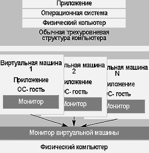 Консолидированный сервер имеет «внешний вид» или физическое представление. Это некоторая аппаратная платформа, работающая под управлением операционной системы, которая выполняет функцию хозяина по отношению к размещенным на ней виртуальным машинам. Для приложений же это множество серверов, работающих под разными операционными системами, каждый из них имеет свой собственный набор периферийных устройств, к серверу может быть подключена консоль и т.д. Любопытно, что появление виртуальных серверов по времени практически совпало с волной консолидации, основанной на тонких и ультратонких серверах. С этой точки зрения данное решение очень похоже на аппаратную консолидацию, где в одной стойке может быть собрано большое количество ультратонких серверов.