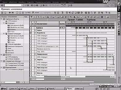 В рамках решения mySAP PLM предлагается широкий набор функциональности, позволяющей реализовать современные методы управления проектами. Для эффективного управления проект должен быть хорошо структурирован — разбит на увязанные между собой пакеты работ. В системе проектов R/3 такая структура носит название «структурный план проекта». Для ведения проекта предоставляются инструменты Project Builder и «Календарный график проекта», позволяющие менеджеру планировать и координировать трудовые, финансовые и материально-технические ресурсы на протяжении всего проекта. Календарный график включает в себя табличную и графическую область в виде диаграммы Ганта. Таким образом, при вводе детализированных данных пользователь видит картину всего проекта (рис. 5).