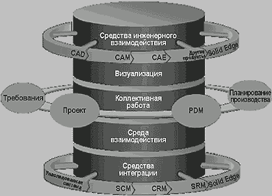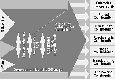 Следующий слой архитектуры — интегрированные средства визуализации TeamCenter, обеспечивающие динамическую визуализацию всех системных двухмерных и трехмерных объектов, поддержку стандартных форматов, полную интеграцию с интерфейсом пользователя. Средства инженерного взаимодействия (Engineering Collaboration) обеспечивают совместную среду для управления данными об изделии, полученными из различных систем САПР: Unigraphics, Solid Edge, AutoCAD, I-DEAS, CATIA и т.п. Одновременно предоставляются интегрированные возможности по управлению инженерными изменениями и конфигурациями изделия, управлению геометрией, документообороту, безопасности, а такие дополнительные средства как проектирование в контексте и новое поколение средств управления цифровыми макетами ускоряют процесс разработки изделия.