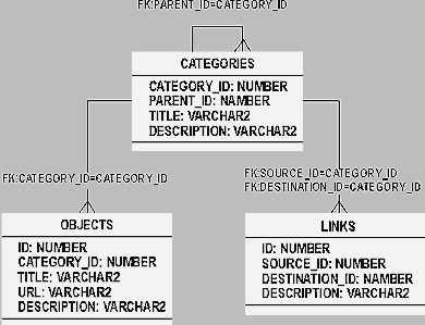 - OBJECTS - таблица, содержащая объекты: id - идентификатор объекта; category_id - идентификатор раздела, к которому принадлежит объект; title - название объекта; url - адрес в Internet; description - описание объекта.