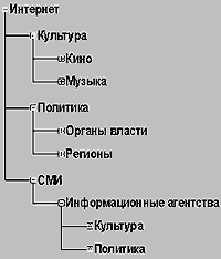 На самом верхнем уровне иерархии находится раздел «Интернет», который в данном случае является рассматриваемой областью. Он содержит такие разделы, как «Культура», «Политика», «СМИ». Те, в свою очередь, содержат другие подразделы и т.д.