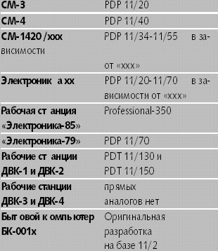 Вариации на тему PDP-11 привились в нашей стране под двумя названиями: СМ-ЭВМ и «Электроника». Параллелизм объясняется тем, что копированием занимались независимо два ведомства. Машины СМ выпускались предприятиями Министерства приборостроения; проектные работы выполнялись в основном в ИНЭУМе (железо) и ИПИАНе (программное обеспечение). «Электроники» и ДВК производились в недрах «закрытого» Министерства электронной промышленности. Число людей, занятых копированием, в разы (если не на порядки) превосходило штат разработчиков самой DEC. С большим успехом PDP-11 и с меньшим — VAX воспроизводились почти во всех странах Совета экономической взаимопомощи. В ГДР они выпускались под именем Robotron, в Польше — Mera, в Венгрии — TPA, в Болгарии и Румынии делались периферийные устройства к ним, в частности, дисковые накопители. Все эти компьютеры были программно совместимы с оригиналом. Украденные версии операционных систем распространялись свободно, документация тиражировалась и на русском, и на английском языках, но при этом кому-то хотелось иметь не только компьютеры, но и операционные системы с русскими именами. В результате RT-11 стала РАФОСом, ФОБОСом и ФОДОСом, а RSX-11 превратилась в ОС-РВ. Говоря о копировании, все же нужно отдать должное тем, чья деятельность заключалась в воспроизведении аппаратуры: это была хотя и вторичная, но непростая и, подчеркну, инженерная работа. Что касается «творцов» РАФОСа, ФОБОСа и других операционных систем, то их участие сводилось к уничтожению комментариев в текстах. Впрочем, программисты стремились заполучить оригиналы и не пользоваться суррогатами. Между копиями и аналогами существует примерно следующее соответствие: