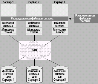 В простейшем случае речь может идти о виртуализации устройств, подключенных к одному серверу. На этих принципах можно построить распределенную систему хранения предприятия (рис. 2). Иногда такое решение называют решением на уровне программного стека: каждый из серверов обеспечивает виртуализацию того сегмента внешней памяти, который к нему подключен, используя собственный менеджер томов. Однако на одном и том же уровне серверы должны иметь специализированное отображающее программное обеспечение, которое обеспечивает им обмен данными под общим управлением администратора системы. Достоинство такого подхода заключается в том, что он не требует никакого специализированного оборудования. Есть, однако, и существенные ограничения. Если идти этим путем, то ресурсы сети хранения (логические номера устройств) должны быть заранее (вручную) поделены между серверами. Тем самым утрачивается одно из важнейших достоинств, суть виртуализации — полная независимость серверов от накопителей.