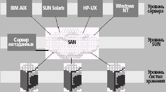 Позиция этой компании по отношению к виртуализации несколько напоминает позицию EMC. Собственно слово «виртуализация» в документах Sun отнюдь не доминирует, но идея интегрированного управления корпоративной системой хранения, реализации которой подчинены все механизмы виртуализации, в полном объеме отражена в инициативе Storage One. Эта инициатива ставит своей целью предложить «полное решение» в области хранения, содержащее в себе все необходимое для надежной и эффективной работы. Storage One состоит из трех уровней; на нижнем уровне находятся дисковые массивы со встроенной кэш-памятью, интерфейсы и коммутаторы, составляющие инфраструктуру сети хранения. Второй уровень образуют средства организации данных, в том числе менеджеры томов и файловые системы. Третий уровень — программные средства управления, обеспечения надежности и готовности.