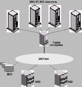 В контексте симметричного пула хранения используется также выражение In-Band SAN Virtualization; термин in-band буквально переводится как «внутри полосы» и применяется в системах связи для указания всего того, что находится непосредственно в канале передачи, например шума или искажения. В данном случае имеется в виду тот факт, что управляющее устройство, SAN Storage Manager, находится на тракте обмена между серверами и накопителями и потому весь трафик проходит через него. SAN Storage Manager осуществляет «трансляцию» физических устройств в логические. Такого рода устройств выпускается пока немного; в качестве одного из примеров можно указать интеллектуальный коммутатор-маршрутизатор SanBlast, недавно представленный компанией SYRED [5]. Он рассчитан на 16 портов Fibre Channel или Gigabit Ethernet, образует RAID-массивы из простого набора дисков и обеспечивает подключение лент и оптических носителей. SanBlast превращает существующую систему хранения в виртуальный пакет дисков. SanBlast допускает подключение SAN-серверов, работающих под управлением Windows NT, Sun Solaris, HP-UX, Linux, других разновидностей Unix.