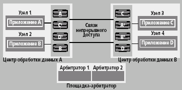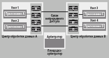 Допустим, имеется два центра обработки данных и одна площадка-арбитратор (рис. 7). На этом пространстве работает кластер из четырех узлов и арбитратора (всего пять). Каждый центр обработки данных содержит два узла кластера и один массив SureStore XP. На каждом узле есть приложение, работающее с дисковым массивом. Между дисковыми массивами установлены связи непрерывного доступа, так что данные приложения А, расположенные на дисках А массива центра А, реплицируются на диски А1 массива, расположенного в центре В. То же самое делается для приложений B, C и D, соответственно. Площадка-арбитратор содержит сервер-арбитратор.
