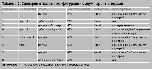 Сценарии в таблице 2 иллюстрируют возможные последствия остановки центра обработки данных и одного или нескольких узлов в конфигурации с двумя арбитраторами. Некоторые сценарии, приводящие к остановке кластера с одним арбитратором, позволяют работать кластеру с двумя арбитраторами.
