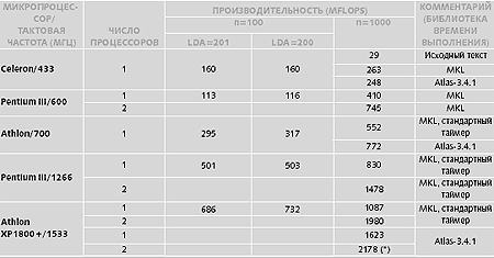 Примечания. Если не оговорено противное, использовался RDTSC-таймер. «Исходный текст» в поле комментария означает, что при n=1000 вместо использования библиотеки времени выполнения применялась прямая компиляция исходного текста соответствующих подпрограмм. lda — это ведущая размерность матрицы коэффициентов системы линейных уравнений. Все тексты компилировались транслятором ifc 5.0 с ключами -O3 -tpp6 [7].