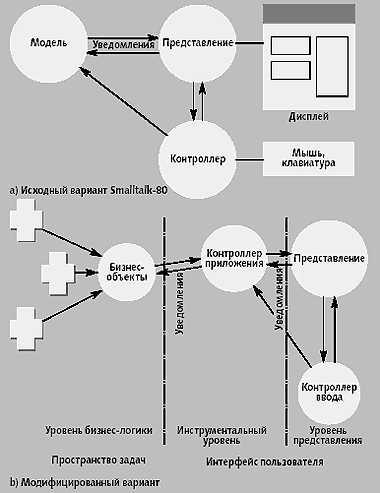 Эта схема позволяет корректным образом разделить все три уровня, но не лишена недостатков. Во-первых, она поддерживает упрощенное представление о модели и не учитывает никакие различия между логикой приложения (скажем, поток управления и координация разных виджетов) и бизнес-логикой (например, оформление покупки). Во-вторых, в большинстве библиотек GUI и оконных систем в виджетах функции представления и управления объединяются, в силу чего их логическое разделение в представлении и контроллере становится практически бессмысленным. В последних версиях Smalltalk в виджетах операционной системы отказались от использования отдельного контроллера. Во всех разновидностях Smalltalk появился дополнительный уровень для поддержки логики приложения, отделенной от бизнес-объектов. Возможно, самым элегантным из них является механизм Presenter в том виде, как он используется, к примеру, в Taligent и Dolphin Smalltalk [4, 5].