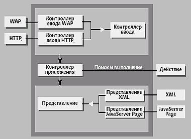 Заметим, что класс контроллеров ввода показан как абстрактный класс с одной реализацией для доступа к приложениям по HTTP с помощью обычного браузера и другой реализацией для доступа к приложениям с помощью WAP-устройства.