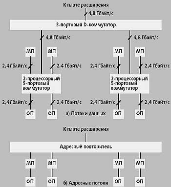 Из рис. 2а ясно, что платы P/M несколько отличаются от аналогичных плат — узлов SGI Origin 3000, ячеек HP Superdome и блоков QBB в серверах Compaq GS [2-4]. Эти отличия связаны со своего рода «неоднородностью» процессоров внутри платы P/M, которые разбиты на пары, соединенные между собой 3-портовым коммутатором данных (далее для краткости будем говорить о D-коммутаторах), а внутри пары используется «двухпроцессорный» 5-портовый коммутатор. Этот коммутатор уровня 0 имеет четыре порта с пропускной способностью 2,4 Гбайт/с (два — для процессоров и два — для памяти) и один порт с пропускной способностью 4,8 Гбайт/с к 3-портовому D-коммутатору уровня 1. Последний коммутатор имеет также порт с пропускной способностью 4,8 Гбайт/с к 3-портовому коммутатору уровня 2 в плате расширения.