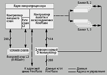На рис. 1 представлена блок-схема UltraSPARC III [6, 7] части его взаимодействия со связанными с ним компонентами Sun Fire 15К. Кроме кэша второго уровня емкостью 8 Мбайт здесь представлены двухпроцессорный коммутатор (он является аналогом системной шины и подключается к межсоединению Fireplane) и оперативная память.