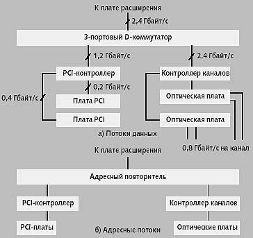 Вместо одного из PCI-контроллеров на плате I/O может располагаться специальный контроллер каналов, к которому подключаются высокоскоростные сетевые платы, работающие с оптоволоконными каналами (рис. 3).