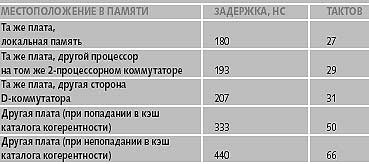 Таким образом, 15 тактов системы (100 нс) требуется адресному межсоединению, чтобы получить глобальный (для данного домена) snoop-результат и отправить его системным устройствам. Доступ к памяти запускается частично во время snoop-процесса и требует 7 тактов (47 нс) после завершения snoop-процесса. Передача данных требует разное число тактов в зависимости от того, через сколько D-коммутаторов при этом придется пройти [6].