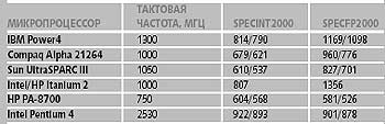 | Табл. 1. Производительность некоторых микропроцессоров на тестах SPECcpu2000 (пиковое/базовое значения) |