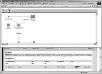 Рис. 8. Примерный вид сетевого графика выполнения работ и протокола прохождения документа (нижняя часть экрана: дата зафиксированного начала и окончания работы, информация о том, кто должен был ее сделать и кто в действительности выполнял и т.д.)
