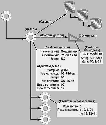 Чтобы получить дополнительную описательную информацию, не содержащуюся ни в 3D-модели, ни в структуре сборки, объекты типа Деталь должны ассоциироваться с объектами типа Документ Электронного Архива, контент которых содержит уточнения и пояснения для полного описания собственно детали.