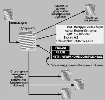 Рассмотрим в свете сформулированных требований концепцию объектов Электронного Архива. Для хранения содержимого архивных материалов, включая тексты, чертежи и изображения, служит объект «Документ». Для полнофункциональной реализации концепции Электронного Архива этот объект должен обладать возможностью хранить содержание («контент»). Содержание Документа соответствует понятию информационного ресурса, в качестве которого может выступать «файл», «сетевой ресурс» или любое другое цифровое представление информации. Содержание Документа может соответствовать любому количеству такого рода информационных ресурсов (множественный контент). Сам объект Документ может входить в структуры, образованные такими объектами. Например, Документ «Перечень Документов» архива технической документации может состоять из нескольких Документов: «Руководящие Технические Материалы», «Рабочие Описания», «Инструкции», а каждый из такого рода Документов, в свою очередь из Документов более низкого уровня (Документ «Инструкции» может представлять собой структуру, включающую в себя Документ «Инструкция по сборке», «Инструкция по ремонтным работам», «Инструкция пользователя» и т.д.).