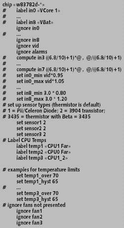 Конфигурационные параметры libsensors в файле /etc/sensors.conf, как уже отмечалось, указывают, как пересчитывать формальные значения, полученные от датчиков, в измеряемые физические характеристики. Формат этого файла, конечно, не так «недружественен», как конфигурация sendmail, однако задание этих параметров системным администратором не только неудобно, но и требует достаточно специфических знаний об используемых микросхемах контроля.