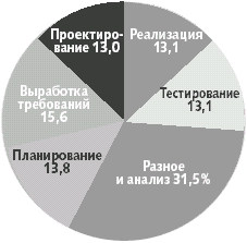 | Рис. 2. Трудозатраты по этапам (в %). Раздел «Разное и анализ» включает этапы старта и анализа по завершении цикла, а также подготовку окончательного отчета и презентации проекта. К «Планированию» относятся этапы планирования и разработки стратегии |