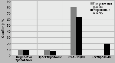 Если учесть объем задачи и ее сложность, то 15,6% трудозатрат на определение требований — вполне приемлемый результат. Но 13% трудозатрат на проектирование — слишком мало и, вероятно, является одной из причин высокой плотности ошибок на этапе тестирования. В курсе объясняется простая методология объектно-ориентированного проектирования, но практического опыта проектирования у студентов недостаточно, пока они не изучат вводный курс анализа и проектирования программного обеспечения. Рис. 3 показывает среднее число ошибок, привнесенных и устраненных на каждом этапе проекта. Видно, что группы находят и устраняют около 80% ошибок еще до начала тестирования. Это очень неплохо для младшекурсников.