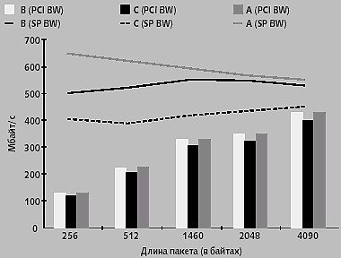 Для того чтобы определить оптимальную величину предоставляемой полосы пропускания и минимальное количество промахов при обращении к памяти для различных параметров предварительной выборки IOH, было проведено множество экспериментов по моделированию ситуаций. На рисунке 8 представлены результаты исследований, проведенных для конфигурации с двумя устройствами Fiber Channel PCI 66/64, к каждому из которых запросы передаются на частоте 250 Мбайт/с при средней нагрузке для трех различных профилей предварительной выборки. Профиль C очевидно неоптимален, поскольку предварительная выборка неэффективна. Профили A и B обеспечивают более высокую пропускную способность, чем профиль C на шине PCI, которая достигает почти 420 Мбайт/с (рост 7-16%), но профиль A использует большую пропускную способность SP, чем профиль B (больше примерно на 30-150 Мбайт/с) при практически той же самой производительности PCI. Это ясно показывает соотношение производительностей между оптимизацией предварительной выборки и определением уровня системной пропускной способности при выборе приемлемых параметров предварительной выборки.