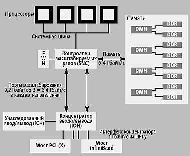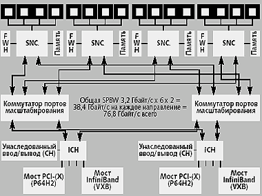 SNC подключен к IOH через два порта масштабирования (Scalability Port, SP). Каждый SP предоставляет полосу пропускания 3,2 Гбайт/с в каждом из направлений. IOH поддерживает четыре интерфейса концентратора для связи с мостами PCI/PCI-X или мостами InfiniBand. Для поддержки унаследованных устройство ввода/вывода используется сокращенная версия интерфейса концентратора.