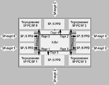 Как показано на рис. 5, каждый SP реализует физический канал и часть уровней протокола SPPD. Существует четыре централизованных модуля протокола SP (SPPC) и snoop-фильтра (SF), которые чередуются для того, чтобы увеличить пропускную способность и упростить физическую структуру, хотя они формируют один логический модуль. Все порты связываются с помощью модуля перекрестных соединений (X-Bar) и сети шин. Эти шины сокращают задержку при критически важных операциях.