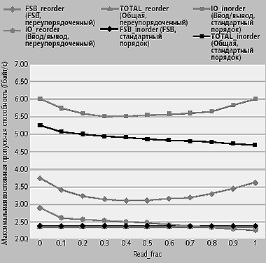На рис. 7 сравнивается схема переупорядочивания с обработкой запросов к памяти в стандартном порядке по уровню постоянной пропускной способности в системе из одного узла для различного сочетания операций чтения/записи. Переупорядочивание, избавляющее от замены страниц и накладных расходов на переключение, увеличивает максимальную постоянную пропускную способность на 12-30%, в зависимости от сочетания транзакций чтения/записи.