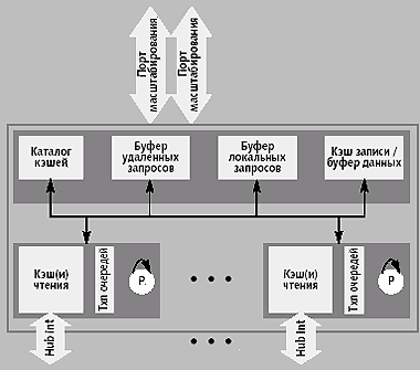 - Кэши чтения (Read Cache). Для каждого интерфейса концентратора выделена одна из кэшей чтения емкостью 4 Кбайт. Полностью согласованные кэши чтения позволяют использовать активный алгоритм предварительной выборки, не предлагая устаревшие данные. Этот размер удобен для хранения достаточного количества результатов операции предварительной выборки при чтении, чтобы компенсировать задержку при обращении к памяти. Независимые кэши чтения предотвращают взаимное создание помех между трафиками различных интерфейсов концентратора.