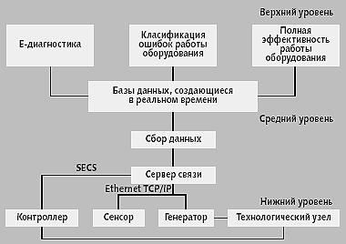 По мере того, как Web-технологии все активнее внедряются в инфраструктуру fab, начинает происходить постепенная унификация стандартов и инструкций. Эта деятельность ведется в рамках совместного проекта Sematech и JEITA, который направлен на создание системы EES (Equipment Engineering System). Эта унифицированная система (рис. 4) описывает действие сетевых связей между источниками данных, механизм сбора и обработки данных. В трехуровневой системе EES (одной из ее подсистем является ОЕЕ) функции Internet-диагностики и АРС становятся практически идентичными. На нижнем уровне используются коммуникационные стандарты для ключевых источников данных — процессингового оборудования и датчиков. Функционально это напоминает простую связку «датчики — сервер», но интерфейс последнего должен обеспечить объектно-ориентированные коммуникации верхнего уровня в целях обеспечения одновременной связи для многих пользователей. Средний уровень включает стандартные методы автоматического управления сбором данных и управления архивной информацией от ключевых источников данных; на этом уровне требуется очень быстро создавать параметрические базы данных, поскольку объем поступающей информации крайне велик. На высоком уровне производится собственно диагностика, обнаружение ошибок и их классификация.
