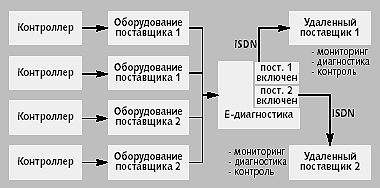 В центральном узле собираются результаты Е-диагностики (рис. 2а), которые в случае однопроводной схемы пересылаются через Internet-канал связи к элементам диагностики удаленного поставщика без изменений в системе съема информации от различных технологических узлов, что позволяет осуществить быстрое внедрение. В случае двухпроводной схемы (рис. 2б) Internet-канал обеспечивает соединение непосредственно с соответствующими интерфейсами работающего оборудования.