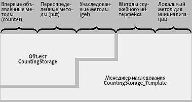 Чтобы создать распределенный объект, реализующий интерфейс CountingStorage с использованием менеджера наследования, необходимо описать класса С++, унаследовав его от CountingStorage_templated. В этом классе обязательно надо определить метод «counter()» (иначе класс будет абстрактным) и можно переопределить метод «put()». На рис. 2 показано, как соотносятся менеджер наследования и унаследованный от него (локально, с помощью наследования С++) объект и где определены различные методы.