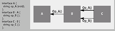 Допустим, при создании объектов, реализующих данные интерфейсы, использовалось наследование реализации. Тогда вызов метода op_A() из объекта C будет переадресован в объект B, а оттуда — в объект A. Такая последовательность вызовов в распределенной системе потребует значительных затрат ресурсов и времени.