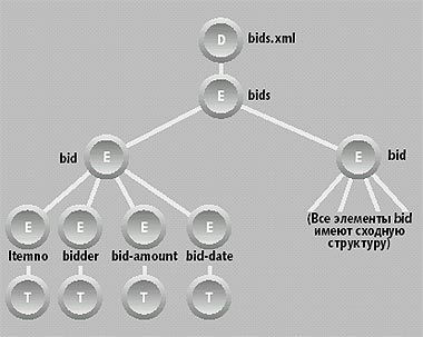 На рис. 1 и 2 показаны модельные представления документов items.xml и bids.xml соответственно (включающие только образцы товара и ставки). Круги, помеченные буквами D, E, A и T, обозначают узлы документов, элементов, атрибутов и тестов соответственно.