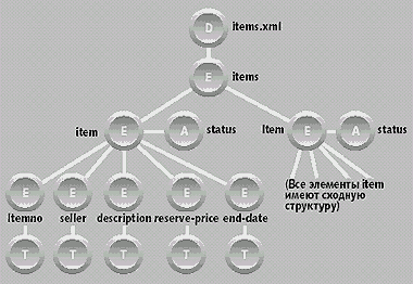 Документ items.xml содержит корневой элемент с именем items, который, в свою очередь, содержит элемент item для каждого из товаров, предложенных к продаже на аукционе. Каждый элемент item имеет атрибут status и подэлементы с именами itemno, seller, description, reserve-price и end-date. Элемент reserve-price указывает минимальную продажную цену, установленную владельцем товара, а end-date определяет дату окончания торгов.
