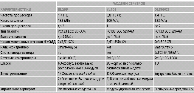 | Примечания. (1) С сильно пониженным уровнем питающего напряжения ULV (Ultra Low Voltage); недавно объявлено о выпуске серверов с 900-мегагерцевым процессором. (2) Диски SCSI имеют возможность горячей замены; UATA — не имеют. (3) Два из них могут быть заменены на контроллеры Gigabit Ethernet. |