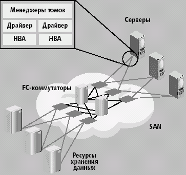 SAN состоит из следующих компонентов (рис. 1): Host Bus Adapters (HBA); ресурсов хранения данных (например, дисковые массивы); устройств, реализующих инфраструктуру SAN (например, коммутаторы — FC-switch); программных обеспечений (например, драйверы устройств, менеджер томов — Volume Manager).