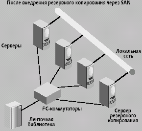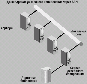 В компании среднего масштаба эксплуатировалась система из нескольких серверов, каждый из которых хранил свои данные на локальных дисках. Резервное копирование производилось по локальной сети на ленточную библиотеку, подключенную напрямую к одному из серверов с наибольшим объемом данных. При росте объема обрабатываемых данных резервное копирование перестало укладываться в отведенное время. Трафик резервного копирования мешал выполнению производственных задач.