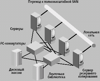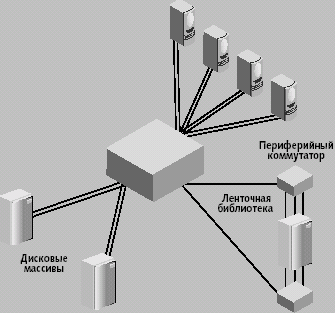 SAN (Storage Area Network) — высокоскоростная сеть передачи данных, предназначенная для подключения серверов к устройствам хранения информации. В основе концепции SAN лежит возможность соединения любого из серверов с любым устройством хранения данных, работающим по протоколу Fibre Channel. Разнообразные топологии SAN — точка-точка, петля с арбитражной логикой (Arbitrated Loop) и коммутация замещают традиционные шинные соединения «сервер - устройства хранения», предоставляя большую гибкость, производительность и надежность.