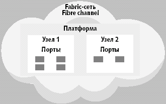Порты Fibre Channel - это базисные объекты, соединяющие все устройства Fibre Channel. Адрес Fibre Channel присваивается каждому порту, так что обеспечивается маршрутизация пакетов на каждое конечное устройство. Порты группируются в узлы, а узлы — в платформы (рис. A). Каждый объект регистрирует свои атрибуты в fabric-сети, когда он входит в эту сеть. Протоколы верхнего уровня могут также определить атрибуты, связанные с конкретными приложениями.