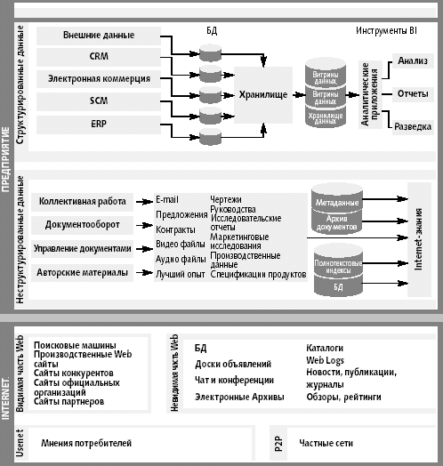 Информационные системы для управляющих (executive information system, EIS), системы поддержки принятия решений (decision support), раскопка текстов и данных (text mining и data mining), операционные хранилища данных (operational data store), многомерная аналитическая обработка данных (multidimensional online analytical processing, MOLAP), реляционная аналитическая обработка данных (relational online analytical processing, ROLAP), а теперь еще и business intelligence — все эти и им подобные многочисленные термины могут лишь ввести в заблуждение любого. На самом же деле главный смысл тех глобальных изменений, которые происходят сегодня, заключается в том, что сейчас, прежде всего, требуется выбирать ДАННЫЕ из традиционных приложений и превращать их в ИНФОРМАЦИЮ, в информацию, которая может быть использована для эффективного управления бизнесом. На основе такого подхода дается следующее определение портала: «Портал — это единая точка входа в корпоративной системе, которая позволяет обнаруживать и высвобождать (identify и unlock) структурированную и неструктурированную информацию из различных источников с тем, чтобы превратить ее в корпоративное знание, необходимое для принятия решений».