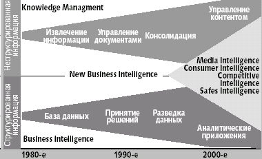 Компания Intelliseek стала одной из первых, кто проложил мост между KM и BI, назвав свой подход New Business Intelligence. Стимулами к появлению NBI, как сказал Каджам [4], стали рост размещенных в Internet данных и эволюция технологий для агрегирования, анализа и подготовки отчетов на основании разнородных источников.