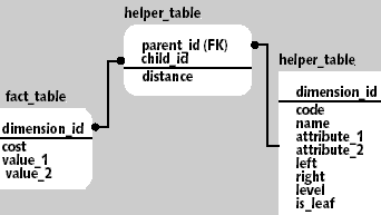 Таблица «dimension_actual» представляет собой таблицу измерений с первичным ключом dimension_id, содержащую корректные атрибуты измерения на сегодняшний день. С ней связана через внешний ключ dimension_id историческая таблица «dimension_history», в которой находится история изменения записей, определяемая датами начала/окончания действия записи (поля date_start, date_end). Актуальная на сегодняшний день запись также присутствует в ней с открытой датой окончания действия. Таблица фактов «fact_table» связана с таблицей измерений через вспомогательную таблицу «helper_table», которая отражает иерархическую структуру измерения.