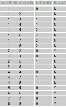 Для простоты работы с таким справочником кроме полей left, right стоит добавить еще два поля: «Level» — уровень узла в дереве, «Is_leaf» — флаг, показывающий является ли узел листом в дереве или нет. Таким образом, мы получаем таблицу «dimension_table» (таблица 2), которая позволяет хранить дерево любой глубины вложенности и размерности и выбирать потомков и родителей с помощью одного запроса.