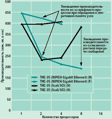 Более высокое качество сети SCI сказывается при использовании уже двух процессоров, а особенно заметно при 8 процессорах. Резкий рост реальной производительности при 8 процессорах, зависимость ТКС-35 (Scali/SCI) (F), объясняется тем, что задача при распараллеливании разбилась так, что уже хорошо локализуется в кэше, и скорость вычислений резко увеличилась, однако высокое качество сети позволило не потерять преимущества за счет роста скорости вычислений (рис. 2). Gigabit Ethernet этого не позволяет: для этой сети пропускная способность на уровне пользователя составляет около 50 Мбайт/c, а задержка передачи сообщения нулевой длины — около 46 мкс.